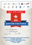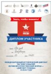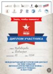 26 апреля 2024 года во всех регионах Российской Федерации прошла Всероссийская акция «Диктант Победы» — исторический диктант на тему событий Великой Отечественной войны 1941-1945 гг. Любой желающий написать диктант, мог присоединиться к этому событию. Наш колледж не стал исключением, обучающиеся колледжа всех курсов и специальностей подготовки приняли участие в написании диктанта онлайн и получили дипломы участников. Диктант проводился в форме тестирования в целях повышения исторической грамотности и патриотического воспитания молодежи.