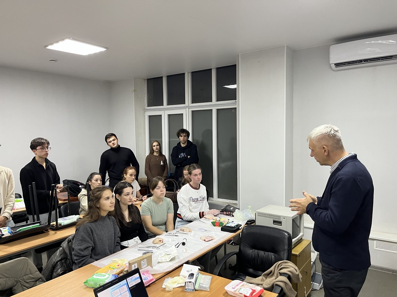 Встреча прошла под эгидой старшекурсников, которые выступили в роли наставников для своих младших коллег. Они не только провели увлекательную экскурсию по миру хирургических инструментов, наглядно продемонстрировав их назначение, но и детально разобрали виды швов и шовного материала, каждый из которых имеет свое строгое применение. Визуализация теоретического материала с помощью проектора и наглядных слайдов позволила студентам лучше усвоить информацию.