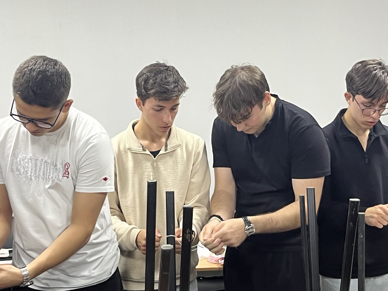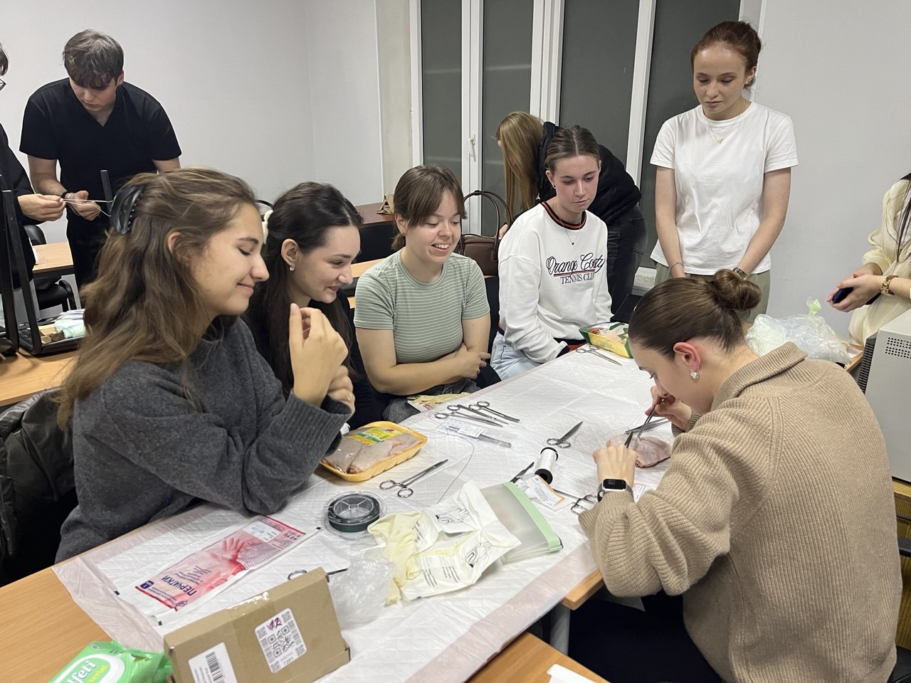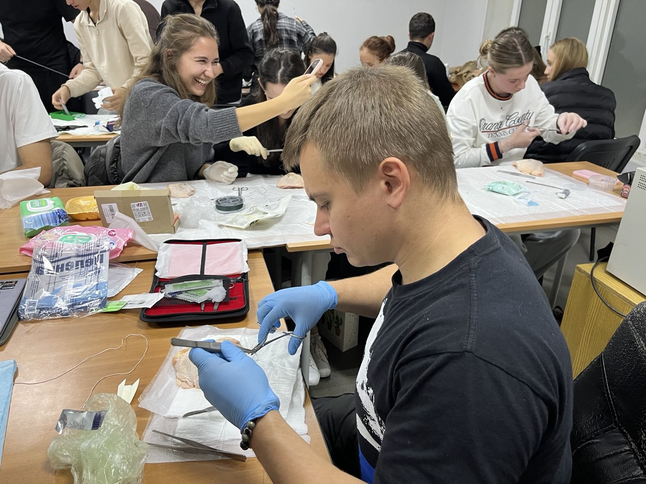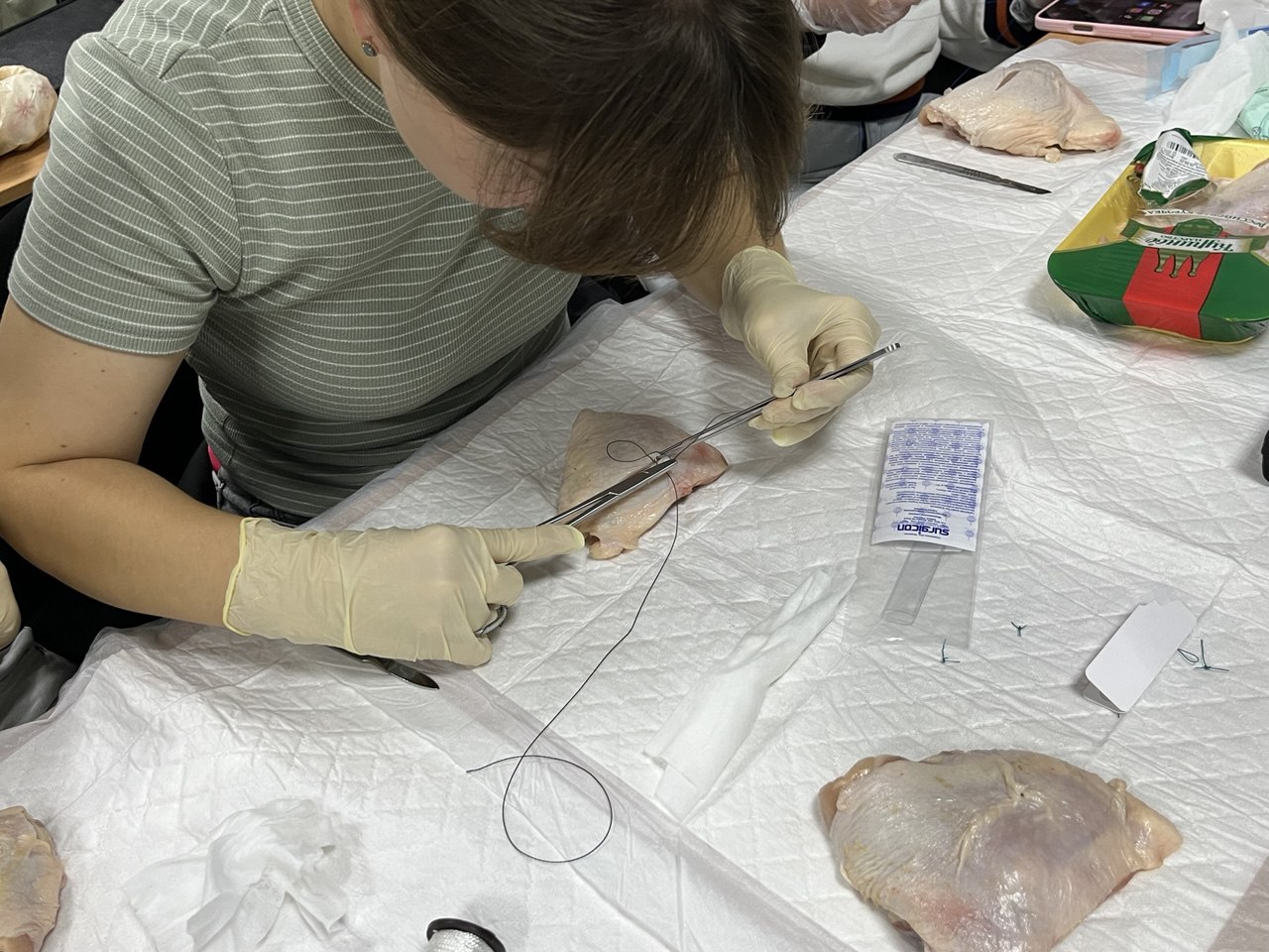 Ребята учились вязать хирургические узлы. На тренажерах и куриных бедрышках студенты тренировались накладывать различные виды хирургических швов, а затем и правильно их снимать. Этот этап был наполнен активным взаимодействием: старшекурсники не только демонстрировали технику, но и терпеливо отвечали на многочисленные вопросы, направляя и поддерживая новичков.
