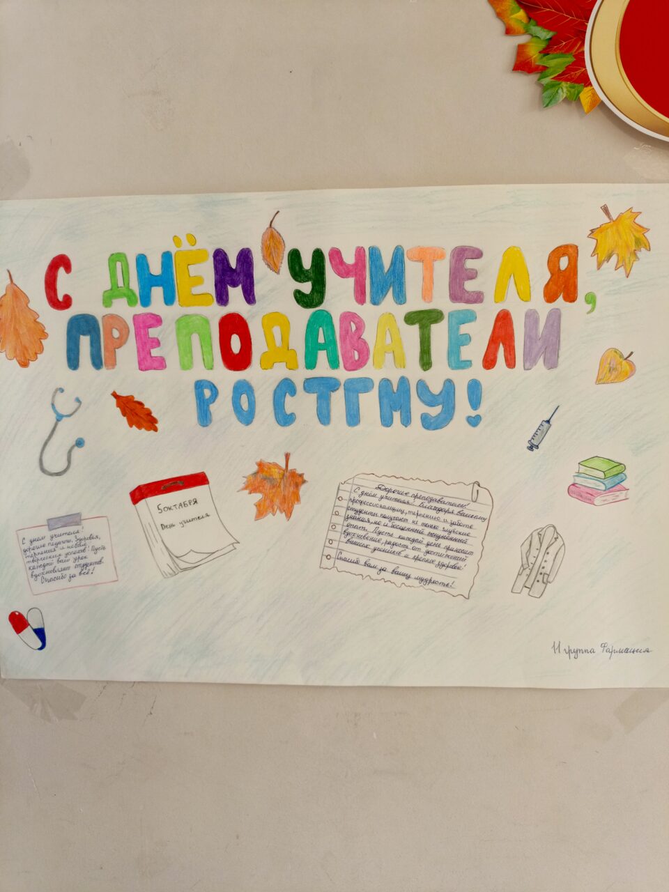 В преддверии Дня учителя 03.10.2025 г. в колледже РостГМУ царила особая атмосфера. Студенческий актив Совета обучающихся под руководством заместителя директора колледжа по воспитательной работе и кураторов студенческих групп подготовили праздничные видеоролики и стенгазеты, в которых приняли участие студенты всех курсов и специальностей подготовки. Студенты не только украсили учебные аудитории и коридоры, но и подготовили свои оригинальные видеопоздравления для своих преподавателей.
