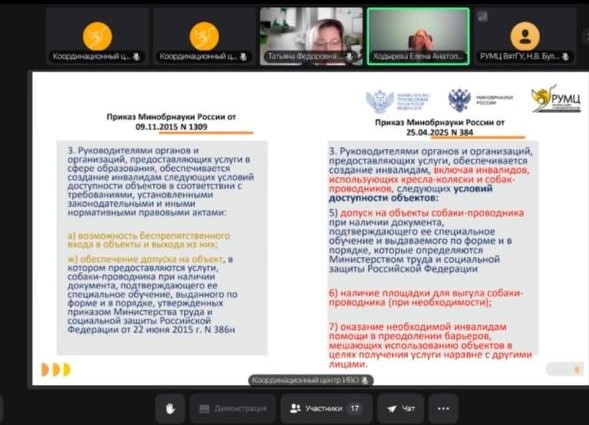 Вебинар проводился для информационно-методической поддержки представителей образовательных организаций высшего образования в связи с вступлением в силу нормативного акта, который актуализирует порядок создания доступной среды для студентов с инвалидностью.