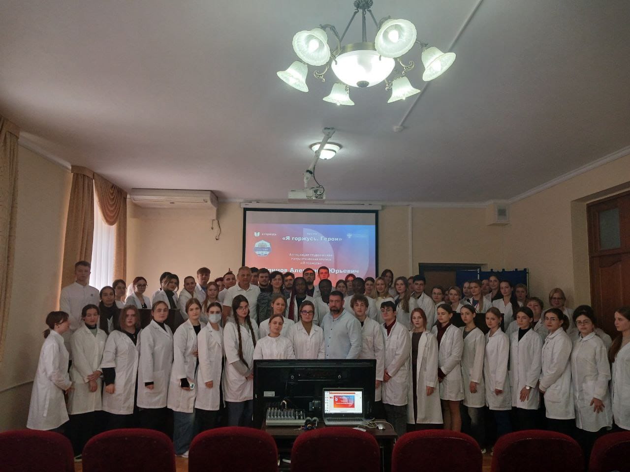 В рамках Всероссийского проекта «Я горжусь. Герои» в Ростовском государственном медицинском университете Минздрава России состоялась очередная тематическая встреча членов Военно-патриотического клуба университета, обучающихся вуза с военным врачом – участником специальной военной операции, антитеррористических операций в разных точках мира — начальником отдела по взаимодействию с новыми территориями вуза Александром Юрьевичем Блиновым.