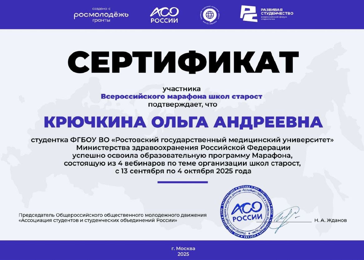 Старосты учебных групп стоматологического факультета Ростовского государственного медицинского университета Минздрава России четверокурсница Ольга Крючкина и второкурсница Яна Журавлева приняли участие во Всероссийском марафоне школ старост.