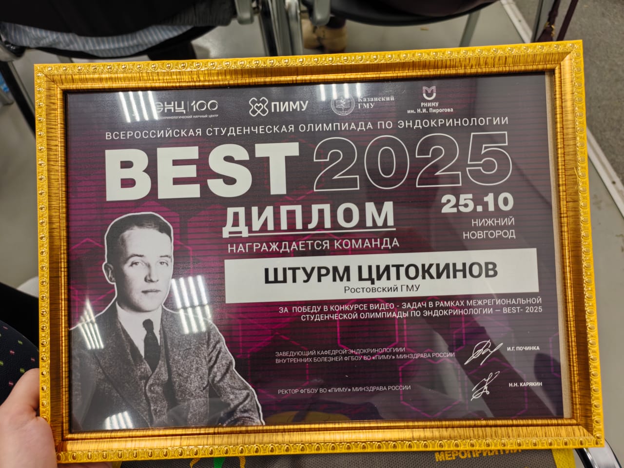 Приз зрительских симпатий завоевали студенты педиатрического факультета Ростовского государственного медицинского университета Минздрава России в финале Всероссийской олимпиады по эндокринологии BEST-2025, которая проходила в Нижнем Новгороде в Приволжском исследовательском медицинском университете.