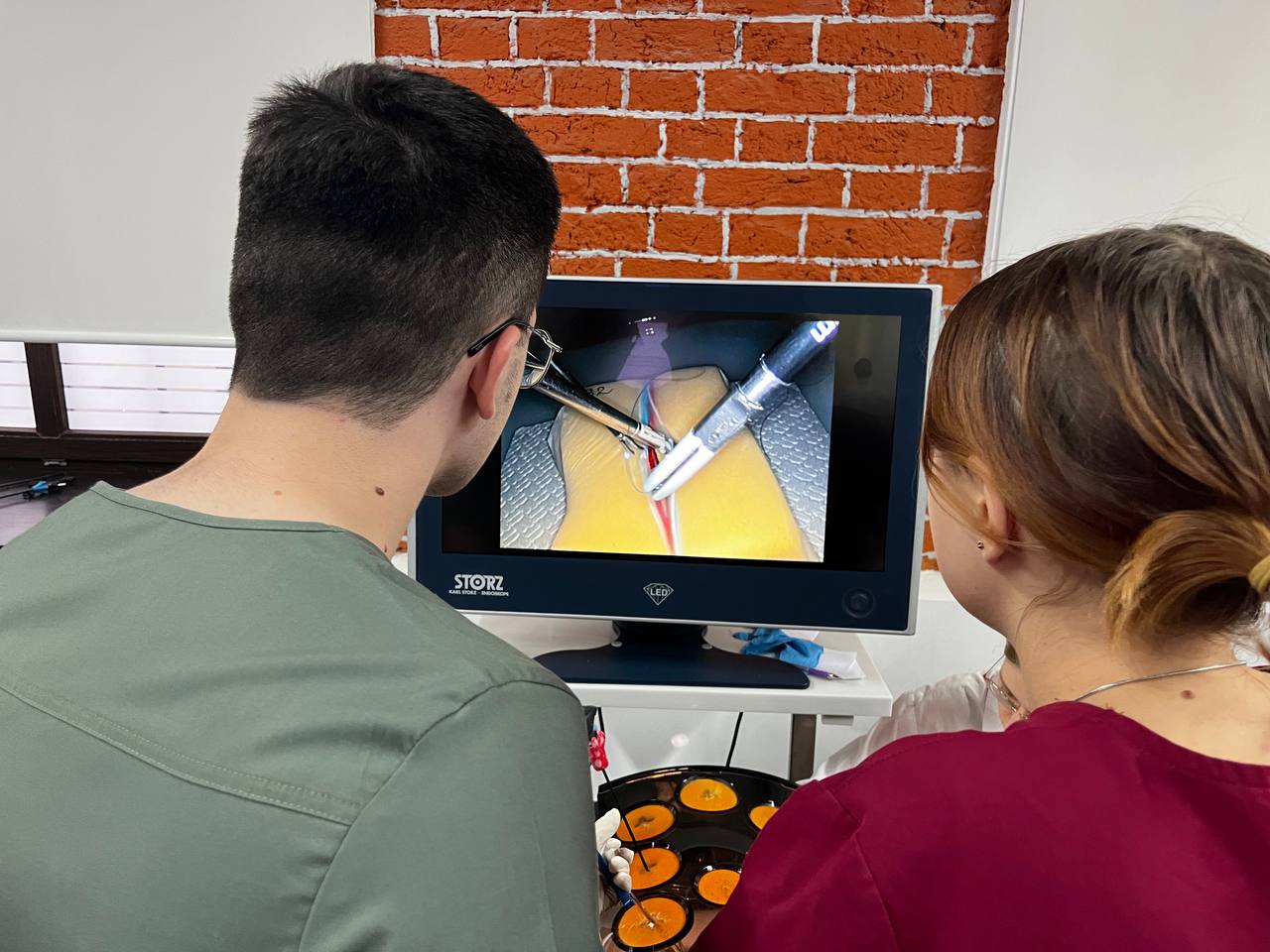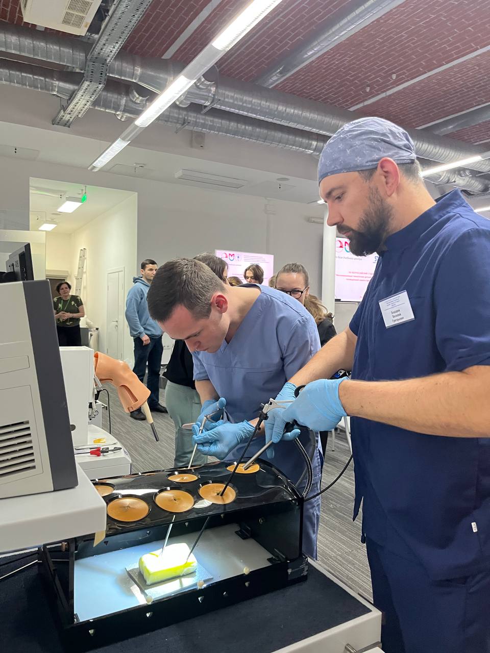На тренажере каждая пара провела лапароскопическую перевязку сосудов, выполнив перевязку варикоцеле. Неплохо все справились и с аппендэктомией с наложением петель Редера.
