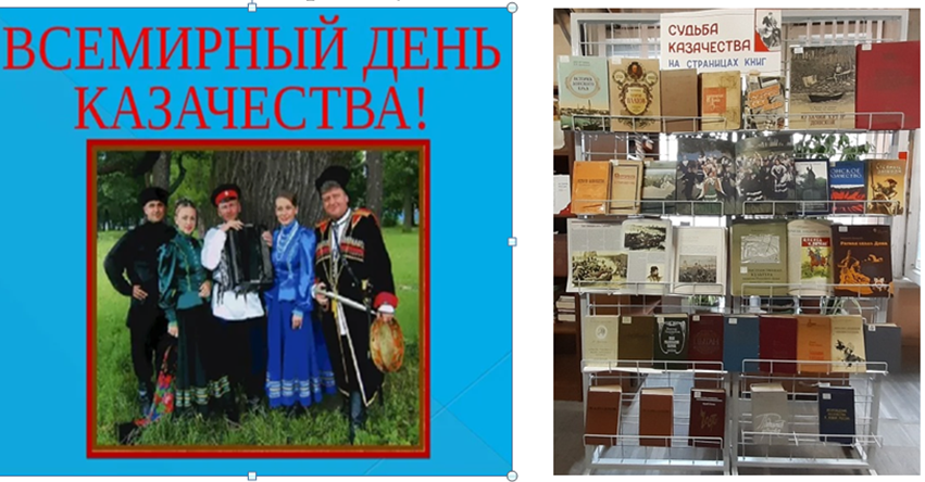 К этому знаменательному событию из фонда нашей библиотеки подготовлена книжная экспозиция «Судьба казачества на страницах книг», на выставке  представлены книги, рассказывающие об истории казачества, традициях, обычаях, военной, хозяйственной и культурной деятельности казаков. А также произведения известных русских писателей: Александра Пушкина, Льва Толстого, Михаила Шолохова, Анатолия Калинина и других, главными героями которых являются казаки.