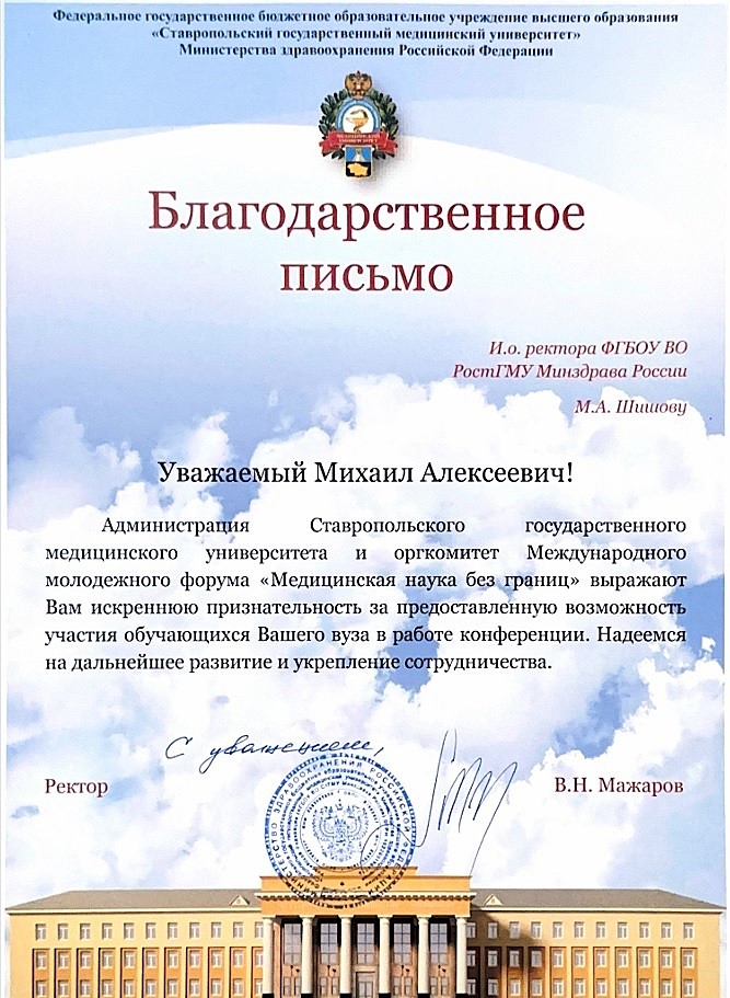 Администрация Ставропольского государственного медицинского университета и оргкомитет форума выражают благодарность и.о. ректора РостГМУ Минздрава России Михаилу Алексеевичу Шишову за предоставленную нашим студентам возможность принять участие в работе конференции!