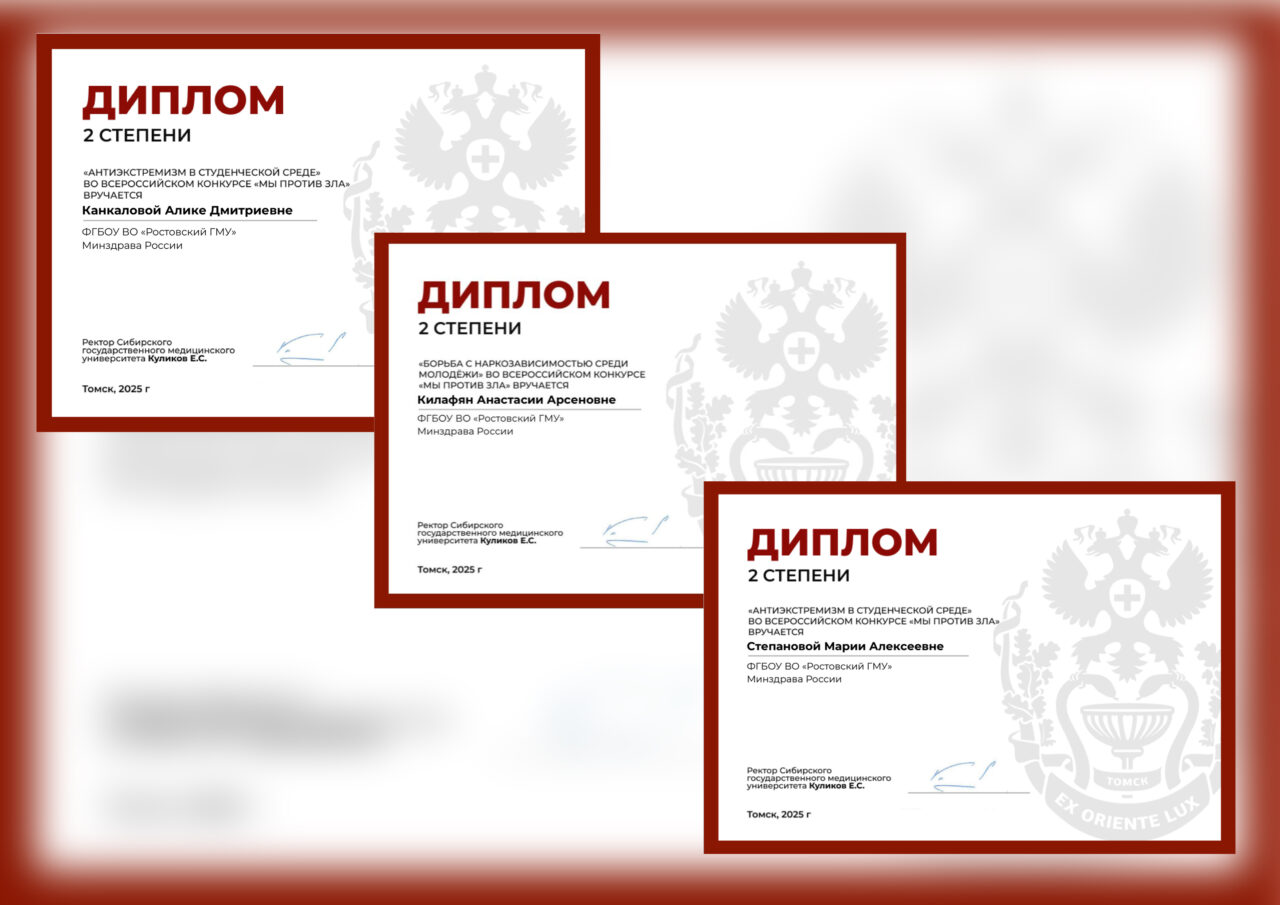Студентки Ростовского государственного медицинского университета Минздрава России Алика Канкалова, Анастасия Килафян и Мария Степанова получили дипломы 2-й степени Всероссийского конкурса «Мы против зла».