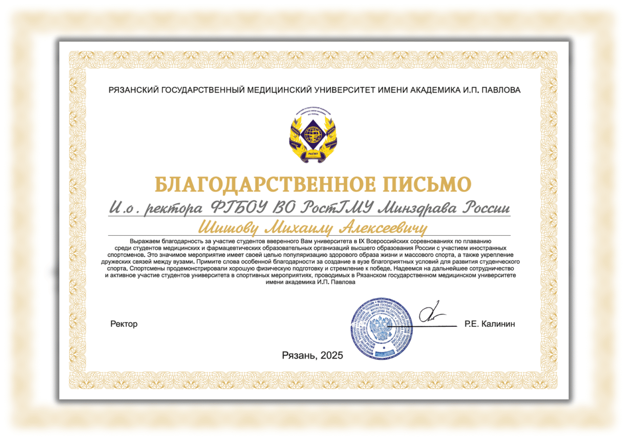 В адрес и.о. ректора Ростовского государственного медицинского университета Михаила Алексеевича Шишова поступило Благодарственное письмо от ректора Рязанского государственного медицинского университета Романа Евгеньевича Калинина.
