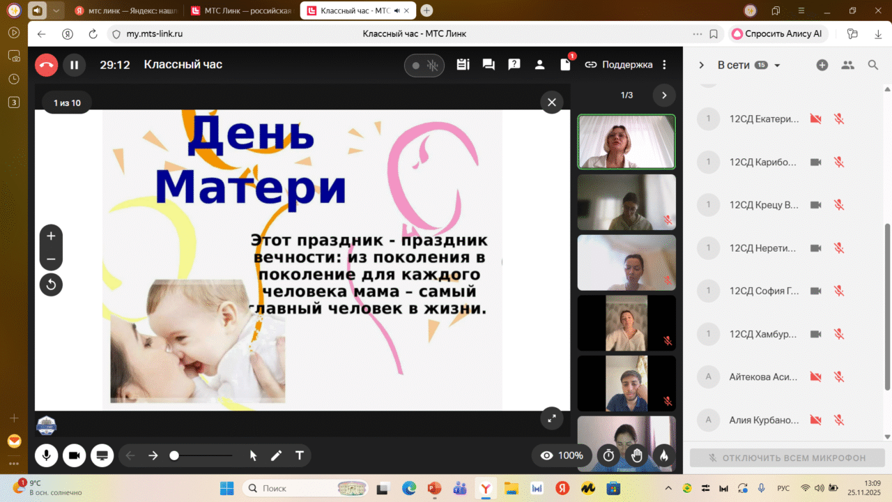 Куратор 12 группы специальности Сестринское дело Пономарева В.А. 25 ноября 2025г. провела кураторский час, на котором студенты Кошуба А. и Певнева В. представили презентацию, поддерживающую интерес студентов в процессе всего кураторского часа. Стихи о маме прочитала Неретина Н., каждый рассказал, что для него значит слово «мама» и какие семейные традиции в их семьях. Студенты 21 группы специальности Стоматология ортопедическая 26 ноября под руководством куратора Иньякова В.В. подготовили праздничную стенгазету и рассказали об истории возникновения праздника «День матери» в России.