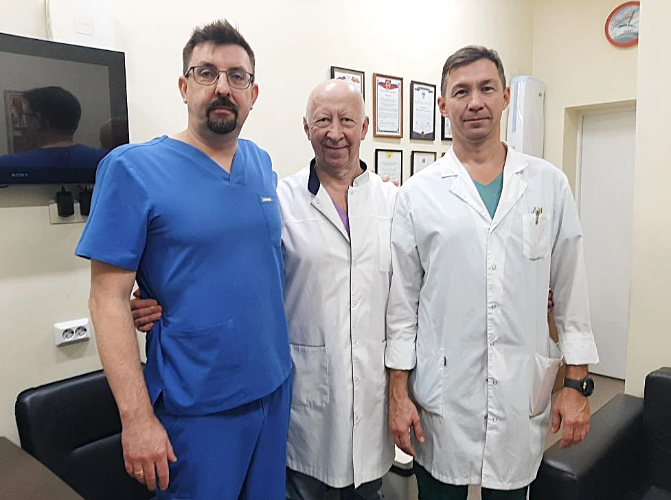 По просьбе благодарной пациентки нашей клиники – Гаяне Темненко — сотрудники медиа центра РостГМУ встретились с профессором, доктором медицинских наук хирургом Юрием Владиленовичем Хоронько, кандидатом медицинских наук хирургом Евгением Юрьевичем Хоронько и заведующим отделением рентген-эндоваскулярных методов диагностики и лечения РостГМУ кандидатом медицинских наук Евгением Валерьевичем Косовцевым.