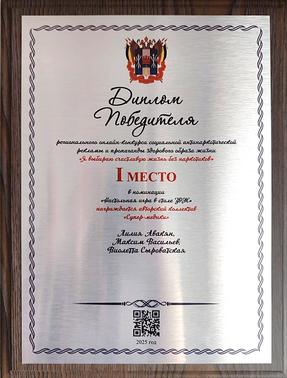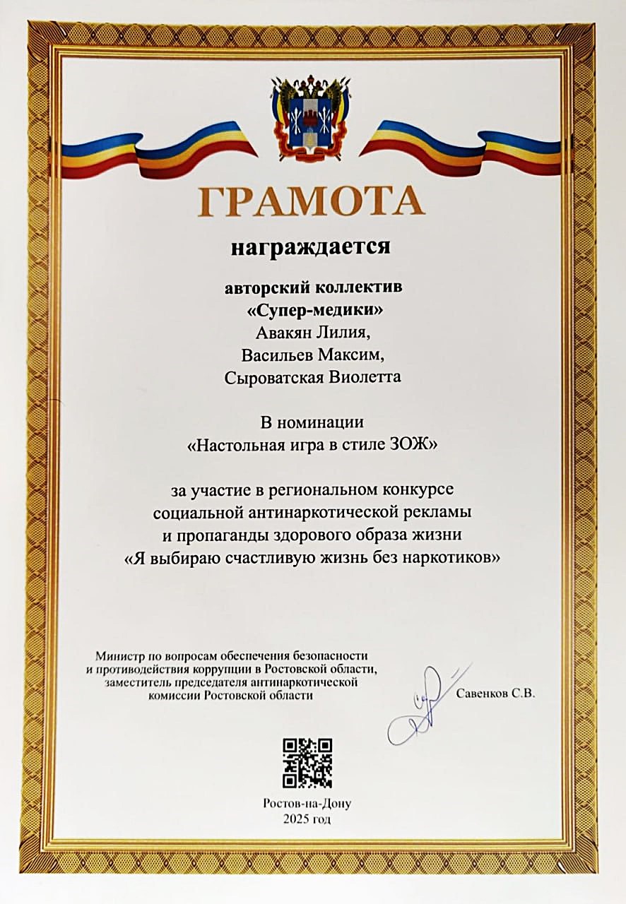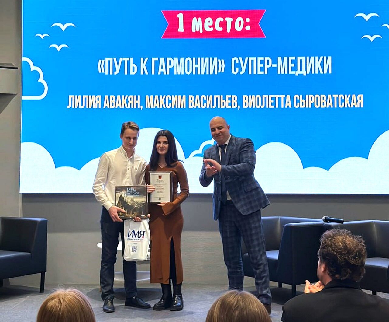 Первое место в номинации «Настольная игра в стиле ЗОЖ» завоевал представляющий РостГМУ авторский коллектив «Супер-медики» в лице студентов 6-го курса ЛПФ Лилии Авакян, Максима Васильева и Виолетты Сыроватской.