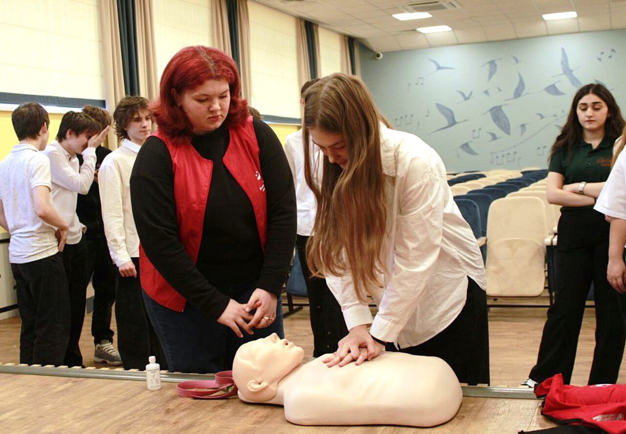 Волонтёры-медики РостГМУ провели для учащихся школы мастер-класс по оказанию первой помощи и показали «прием Геймлиха».