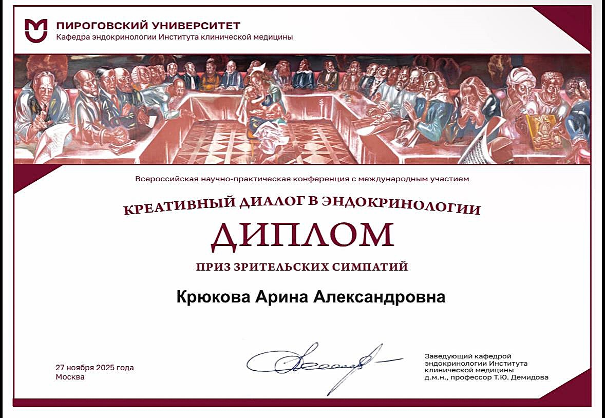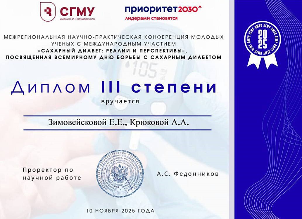 На Межрегиональной научно-практической конференции молодых учёных с международным участием «Сахарный диабет: реалии и перспективы», приуроченной ко Всемирному дню борьбы с сахарным диабетом, проходившей в Саратовском ГМУ им. В. И. Разумовского Минздрава России, активисты кружка – ординаторы первого года кафедры эндокринологии (с курсом детской эндокринологии) Елизавета Зимовейскова и Арина Крюкова заняли III место, представив доклад «Использование искусственного интеллекта для оптимизации самоконтроля у больных с сахарным диабетом».
