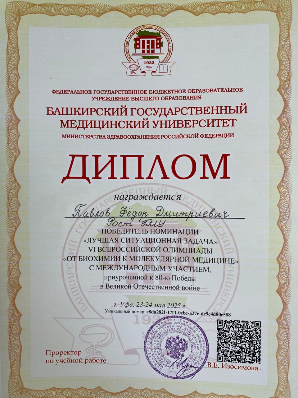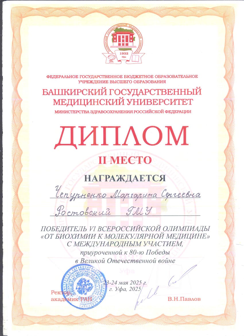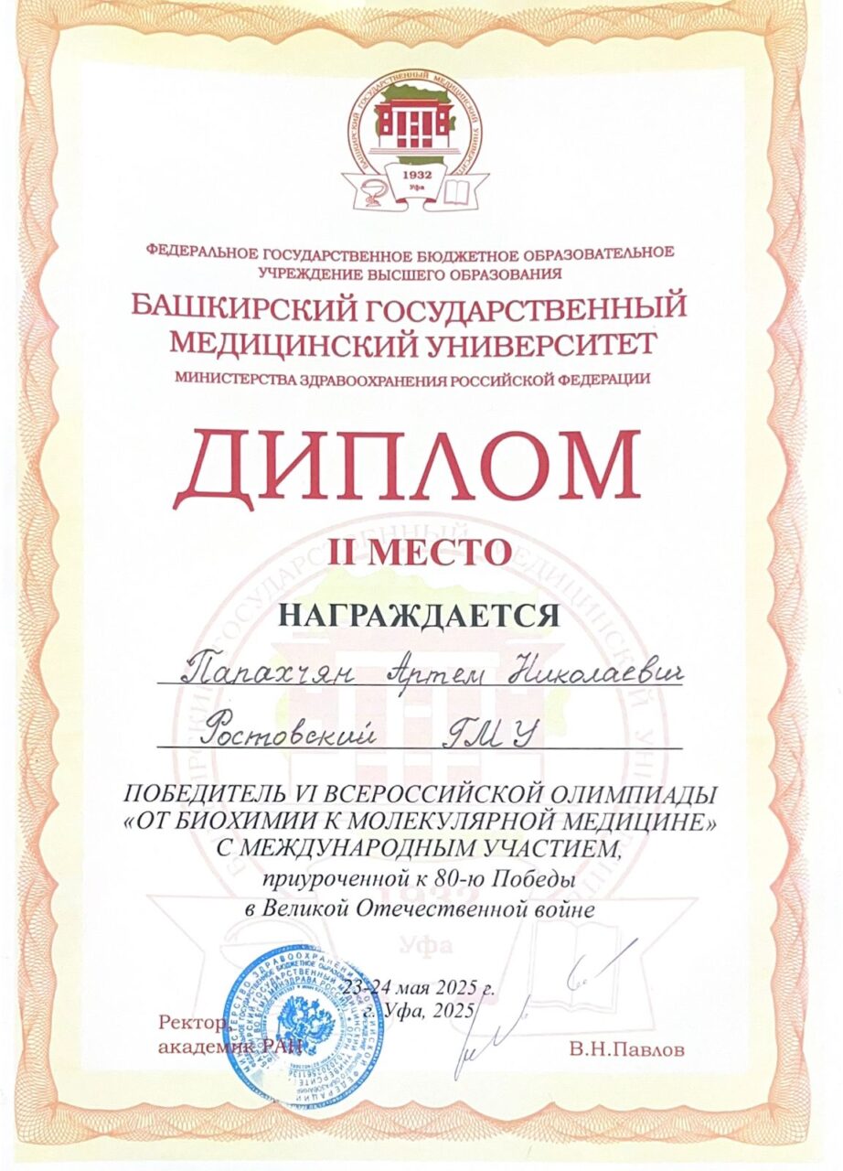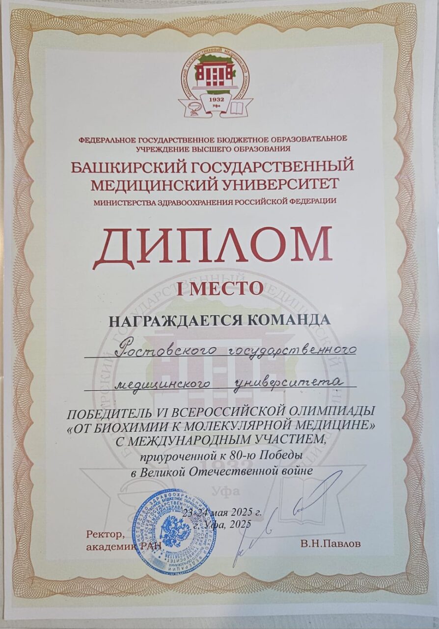 23-24 мая 2025 года в Башкирском государственном медицинском университете (г. Уфа) состоялась VI Всероссийская олимпиада «От биохимии к молекулярной медицине» с международным участием, приуроченная к 80-летию Победы в Великой Отечественной войне.В олимпиаде приняли участие 115 студентов 26 медицинских и классических вузов Российской Федерации, Белоруссии, Казахстана, Киргизии, Узбекистана.