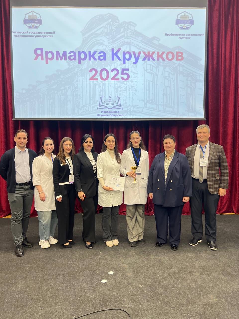 «Ярмарка кружков – 2025» состоялась в Ростовском государственном медицинском университете. Она стала особым запоминающимся событием для студентов, ординаторов и преподавателей вуза. Второе место в конкурсе завоевало Молодежное хирургическое общество на базе кафедры хирургических болезней №1. На фото куратор МХО ассистент Никита Станиславович Лукьянов, староста МНК кафедры Дарья Балясникова, председатель МНО РостГМУ Ани Османян, начальник научного управления Марина Владимировна Гулян, член команды МХО Мариам Оганесян, председатель МХО Екатерина Людмирская, зав.каф. хирургических болезней №1 Наталия Германовна Сапронова, декан стоматологического факультета Владимир Вячеславович Алексеев.