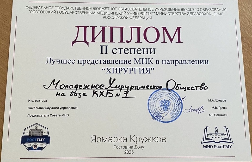 В РостГМУ подвели итоги 77-й научной конференции, которая состоялась 10-11 мая 2023 года и наградили её победителей и призеров. В секции «Хирургия, травматология» подсекции «Оригинальные исследования» первое место заняли студенты-кружковцы А.Ф. Баландин, С.В. Негода, М.В. Кобзарева, А.А. Фролова за доклад «Хирургическое лечение больных с осложненным циррозом печени». Научные руководители Н.Г Сапронова, Д.С. Калинин, Д.В. Стагниев.